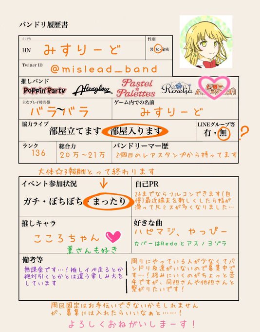 履歴書かいてみました〜!なるべくお迎えいけるように頑張ります💪こころちゃん推しの方ぜひ……! #バンドリ履歴書 #バンドリーマーと繋がりたい