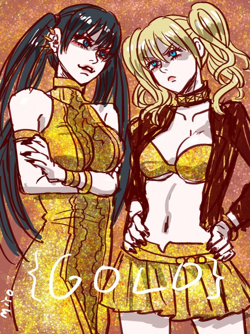お題:『ゴールド(GWでも可)』 ゴールド衣装の仲悪姉妹!連休終わりそうでつらい。。。 #三家本礼作品版深夜のお絵描き60分一本勝負
