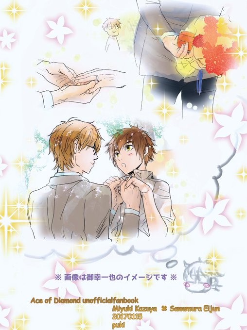 来月のHMSでpukiさんの所で頒布される 『結婚相談所に行った御幸一也が理想の天使を嫁にするまで』の カバー及び本体の表紙・裏表紙とカラーピンナップ二枚を描かせていただきました(´A`;)オソレオオイ.. 掲載許可が出たので、こちらではカバーの裏表紙のっけときます~!