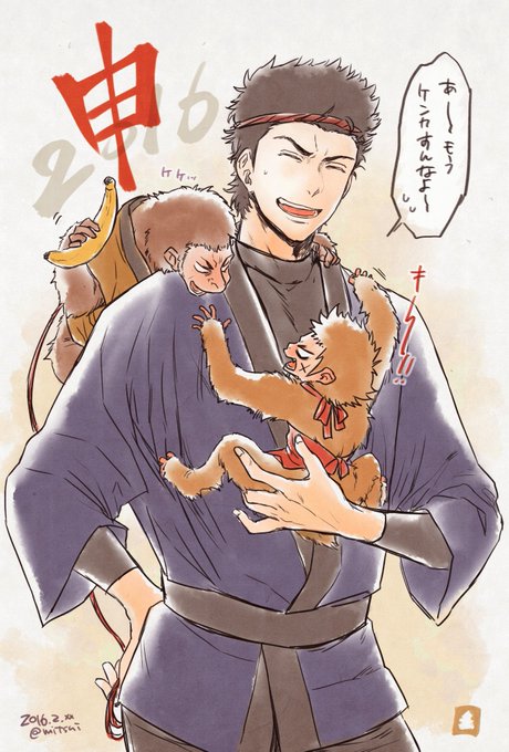 2月ももう終わるけど、今年の年賀状はこんな感じでした〜〜〜!和服でお祝いな薬師メンバーと、おまけで描いた猿回しナーダ&轟親子猿🐒🐒