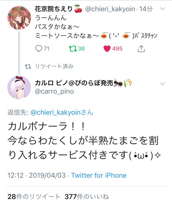 カルボナーラに半熟卵を割ってくれるサービスをするピノ様 #カルロピノ #ピノの自由帳