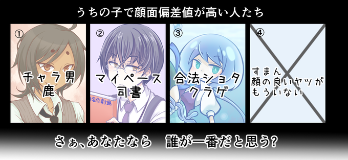 顔面偏差値(イケメンに限らなそう)ということでエボシも入れつつそれでも3人しかいなかった件 興味本位でアンケ取るのでよかったら投票でもしてってくださいな(リプで繋げます)