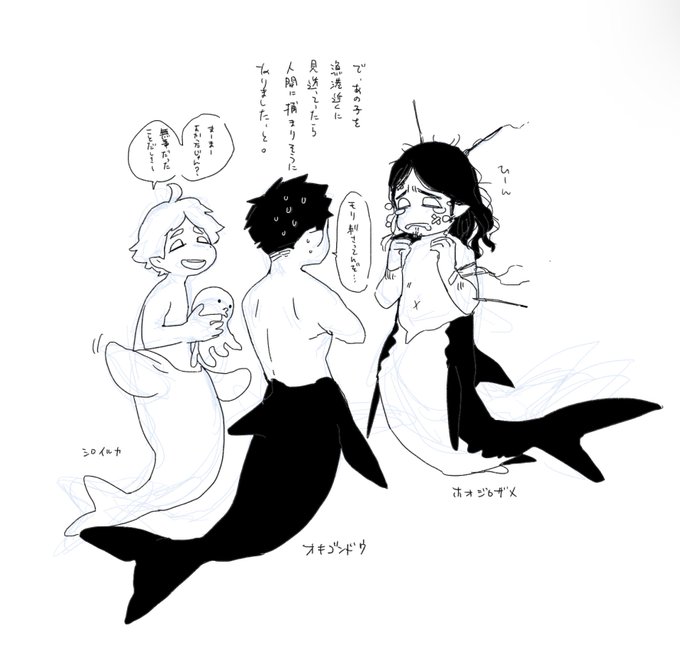 早く寝るようにしてるので何も描けてなくてすみません…数字伸びないけど気に入ってるの再しとこ 人外好きなんですよね… 穏やかな性格で綺麗な顔をしているのに捕らえた獲物は無感情に貪り食う「人間ではなさ」が好き シャチピとサメピは別世界の個体です(?)手首から肘のヒレ要らなかったな