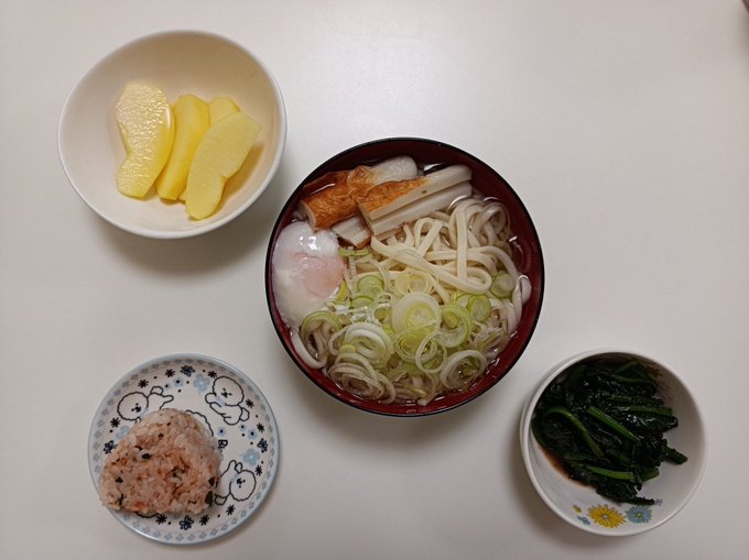 今日の夕食は鯛うどんとほうれん草のおひたしとおにぎりとりんごだヨ!😋