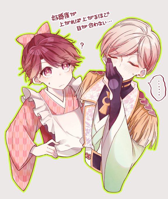 こっちも描きたかった看板娘な乙成とどんどん好きになってる胃痛王子こと帳君。帳君は乙成への好感度が上がれば上がる程、顔が直視出来なくなったり、上手くお喋り出来なくなったりと、今以上にヘタレ全開になってくれたら可愛いな……