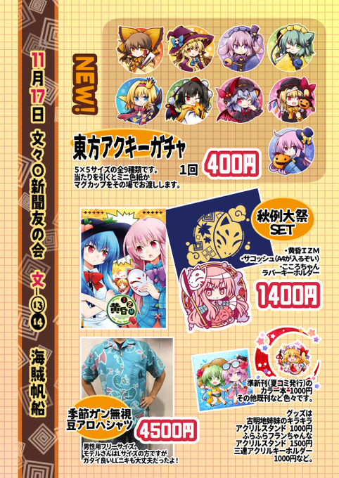 日曜に京都で行われる「第百三十四季 文々。新聞友の会」のお品書きですー。文-13.14海賊帆船じゃよ。