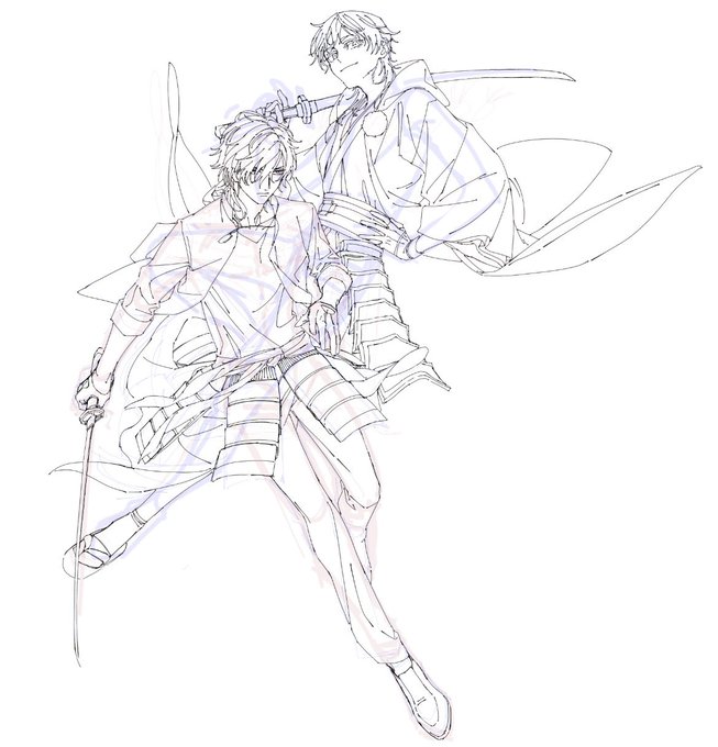 ③身体の形が取れたらそれに沿って服を着せたり、細かいところをもう少し描きこみます。せっかく描いた腰身体のラインがどうしても隠れる時は泣いています。線はまだガサガサです。