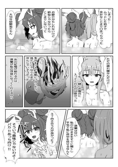 例大祭での新刊『腐れ縁だって…悪くない!』のサンプルです! ずぶ濡れの鈴仙を気に掛ける清蘭ちゃんの2人による短編漫画です🐰🐰 (1/2)