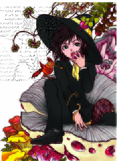 #キノコの日 なので、高橋葉介本「エゴイスタ」表紙・裏表紙画を。 後ろの実っぽい植物たちも、菌糸植物。 マン少マミーの座ってるハイドネリウム・ピッキーもどき、このヒダヒダはねつ造です。実物はもっとスポンジっぽい様子。 #きのこの日 #夢幻紳士