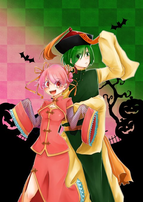緑はキョンシー、ピンクはチャイナ娘のイメージです。 #擬人化 #色擬人化 #色いろ_色擬人化 #色いろ_ハロウィン