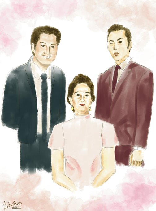 Nanay Luming (middle), Tatay Hermiñano (right), and papa lito (left) in a pencil-watercolor fashion.