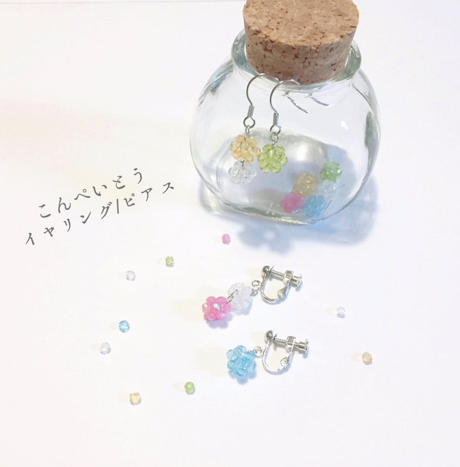 「こんぺいとうイヤリング(改)」 よりこんぺいとうっぽく◎片方が長いアシンメトリーな作りになっています♢ 時間があればイラストの方を少し変更する予定です… #イラストのアクセサリー #ハンドメイド #デザフェスvol45