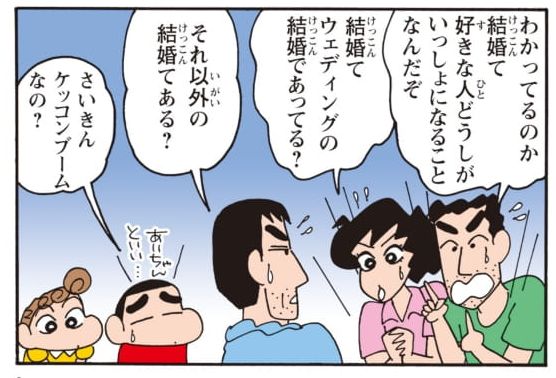 昨年の「#クレヨンしんちゃん」原作30周年でも話題になった「せまし婚約編~結婚編」が丸ごと収録。