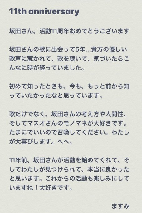 【@sakatandao】【@sakatansab】 坂田さーん!活動11周年おめでとうございます🎉👏 4枚目にメッセージを書いたので、時間があってもし気が向いたら読んでみてください #あほの坂田11周年 #となりの坂田11周年 #坂田さん11周年おめでとう