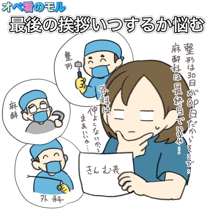 関わる科が多いし、OP日の都合もあるから異動や退職前の挨拶をいつするかめちゃくちゃ悩むよ! #手術室 #オペ看のモル #手術室看護師 #看護師 #看護学生 #オペ看 #イラスト