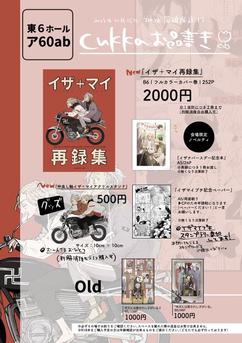 【お品書き】 10月15日 TOKYO罹破維武 17 サークル名:cukka スペースNo.ア60ab 🎃イザマイプチ参加しております。スタンプラリーへ参加される方はスタンプカードをご提示ください。 当日はよろしくお願いします!