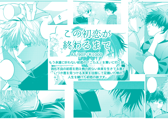 7/13 西4 L29a ぶるーあわーで参加します 新刊『この初恋が終わるまで』A5/90P もう永遠に叶わない初恋の「こたえ」を貰いに行く話。消化不良の初恋を抱え悟の居ない未来を生きてる恵と、いつか恵を見つける未来を目指して足掻いた悟の人生を賭けた初恋がハッピーエンドになるまで✨ (五伏)
