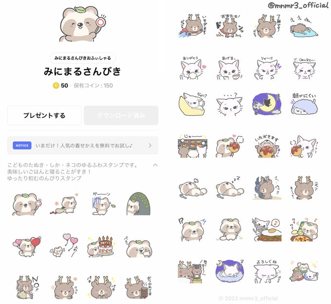 ビックニュース!LINEスタンプをリリースしました! たぬきさん、しかくん、ネコちゃんに協力してもらいました😊 風船飛ばしちゃったときのたぬきさんのショットがオススメです🎈 https://t.co/vkiPnbsRZ3 #LINEスタンプ #ラインスタンプ #みにまるさんびき #癒し #かわいい