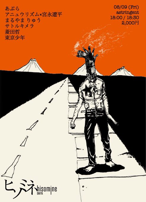 次のライブはこちらです。 8/9(金) ヒソミネ (https://t.co/08ZYhNayqS) 「astringent」 open18:00 / start18:30 2000円+1drink 【出演】 あぶら アニュウリズム×宮永遼平 まるやま りゅう サトルキメラ 菱田哲 東京少年 僕の出番は19:05〜の予定です。 是非お待ちしております!