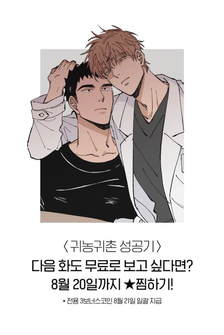 귀농귀촌 성공기 1화 선공개 했습니다! 다음주 이시간 6화까지 정식 오픈된 후 월요웹툰으로 찾아뵐 예정입니다. 1화를 찜하시면 다음화를 무료로 볼 수 있는 쿠폰을 드리는 이벤트중이니 참여 부탁드립니다~^_^