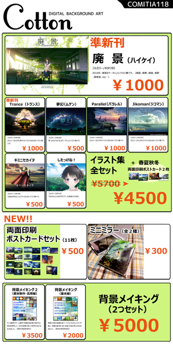 COMITIA118【D01a】Cotton頒布物④ イラスト集『Trance』 リアル系&ファンタジーの風景メインのイラスト集です。