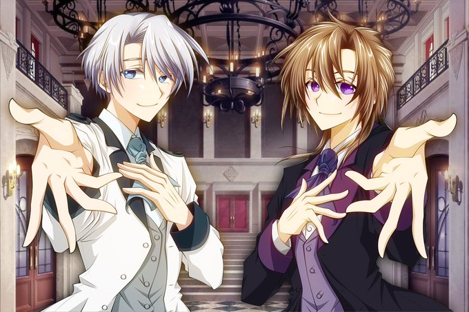 #ホワイトデーは銀髪白髪を愛でる日 ハロウィン学園のプラセボ兄様と、 天空都市のギルド員たちのトモエくんと、 王冠とチェスのチェレンがいるね!