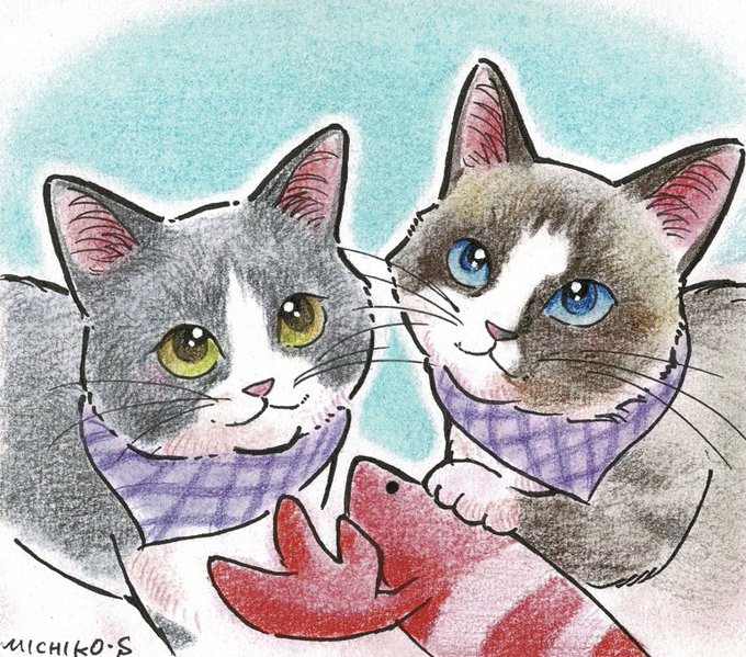元旦に偶然出会った猫展にて、コテツとまるの似顔絵を描いていただきました😊