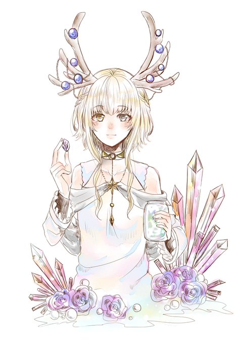 もへじには重く立派なシカの角が生えていて、そこに瑠璃の石を飾っています。瞳は金と銀のオッドアイで髪はクリーム色。鉱石そっくりの飴やゼリー菓子を作る職人です。