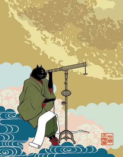 #中秋の名月 月を見るもの。天体観測の好きな黒猫です。夜はそろそろ寒いので、足先を赤い布袋で覆っています。
