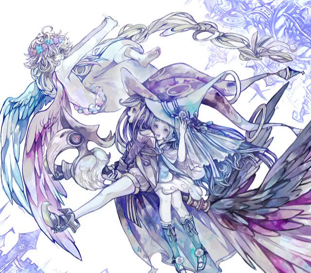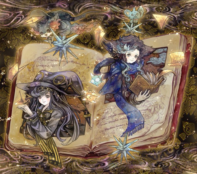 .@fl_um 雲と空の美しいコントラストが広がるうちの魔法学校を白提くんとリースちゃんに案内する夜子だよ!リースちゃんの音楽魔法で世界を照らして白提くんが大好きなお花で空を彩る!一層華やかになった大空を夜子がホウキで駆け抜ける!大はしゃぎする3人です!