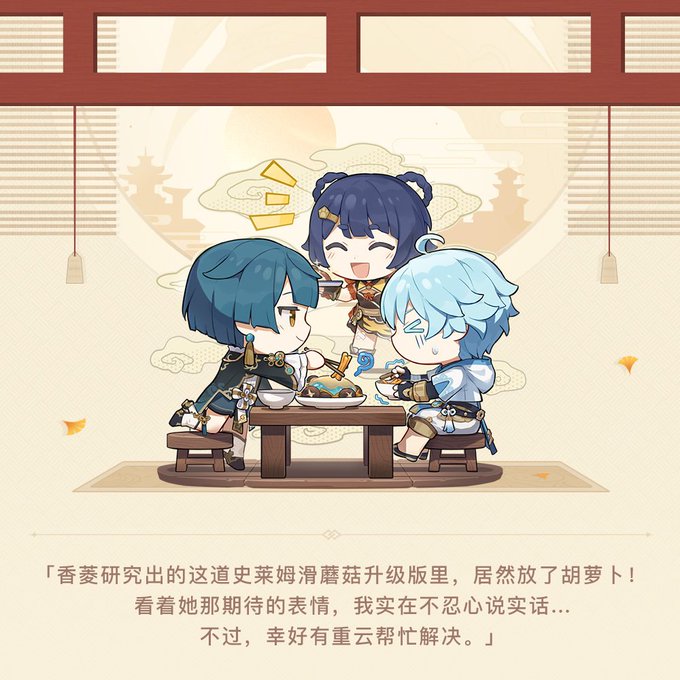 "Inside of Xiangling's new and improved mushroom slime stew, she put carrots! Seeing her expectant look on her face, i dont dare to say the truth...But, thankfully Chongyun is there to solve the problem."