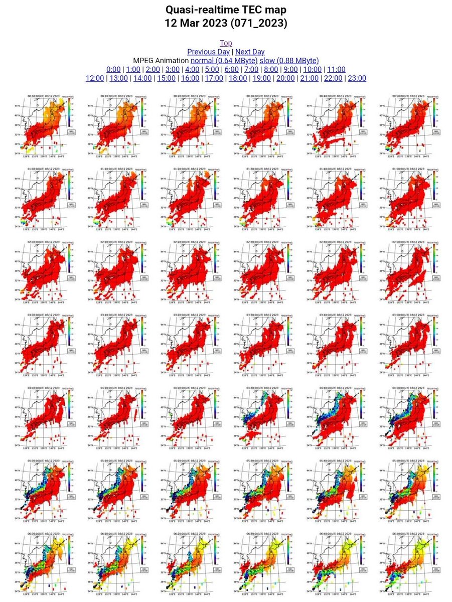 3日 #TEC異常 GEONET 準リアルタイムGPS全電子数マップ (最新6時間、10分間隔)