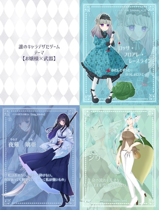 愛藍さん主催の誰デザに参加させて頂きました!私は⑥、アデリア様のイラストを担当させて頂きました!さて、私のデザインはどのお嬢様でしょうか?(それにしても…全員可愛い&美しい………✨😇✨) #誰のキャラデザだゲーム #誰デザお嬢様と武器