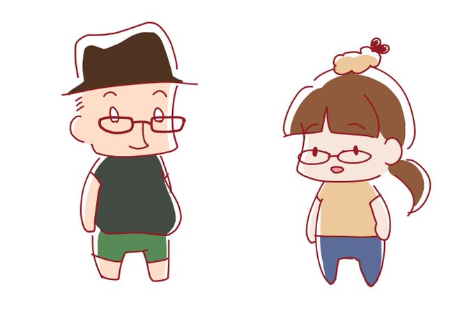 夫婦の自画像描きました。それぞれ好きなえび天とハットを頭に乗せています。