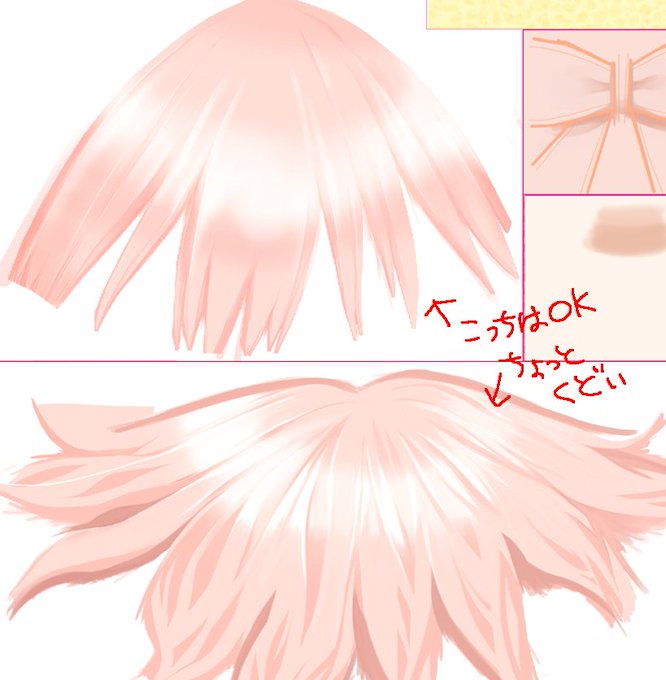 テクスチャを直しています。影を追加したり。これやり始めると永遠に終わらないやつ。後ろ髪のウェーブが3Dになった時にちょっとくどいのでもっとシンプルにする。