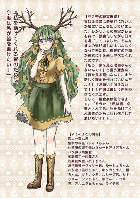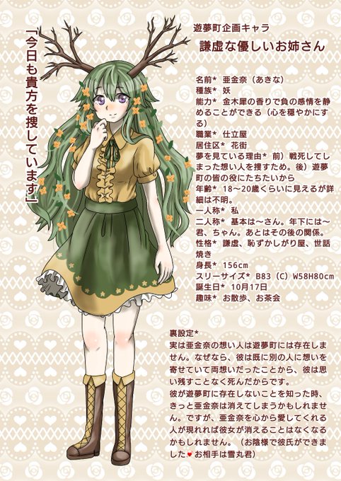 亜金奈は元々金木犀の木で、庭師の青年に恋をしました。しかし、彼は戦争に行きその後帰って来ることはありませんでした。「もう一度彼に会いたい!会って話をしてみたい!」という強い想いから遊夢町にやって来ます。死者もいるこの世界ならきっと彼が居るかもしれないと…。
