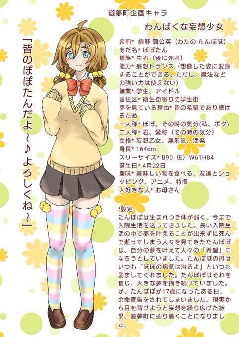 たんぽぽは病気持ちの女の子。いつか病気を治して夢を叶えるのだ!といつも夢を見ていました。しかし、ある日余命1年と宣告されてしまいました。絶望のあまり夢の世界に閉じ籠り、そのまま遊夢町へ。遊夢町でも彼女は人気アイドルとして活動中!夢に逃げてしまった彼女の物語の始まり始まり!