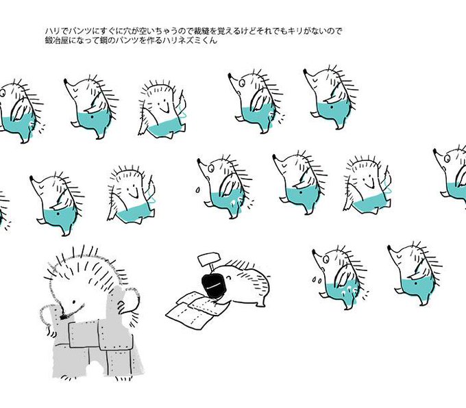 無理無理だけどかいてみた^^ RT @ajima @momoro66 ハリでパンツにすぐに穴が空いちゃうので裁縫を覚えるけどそれでもキリがないので鍛冶屋になって鋼のパンツを作るハリネズミくん描いてください。無茶ぶり