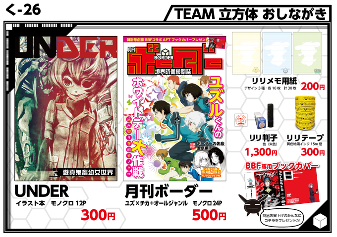 とりあえずVAVA氏がMADのメイキング本とかトリオン兵の3Dモデリング集等、私は受注生産のワートリネタグッズ、後kzyさんも巻き込めそうだからかっけーイラスト拝める (とりあえず広報担当mon)