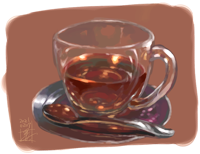 前に自分で撮った写真の中から、透明感と光の表現をつかむための30分模写。 アルミニウムのソーサー+ガラスのカップ+紅茶