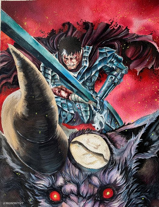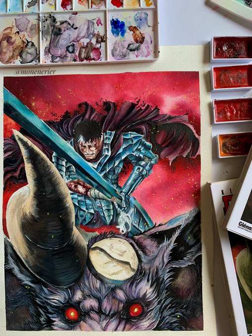 Cover de Berserk - Guts en armure avec Zodd réalisé en aquarelle et peinture