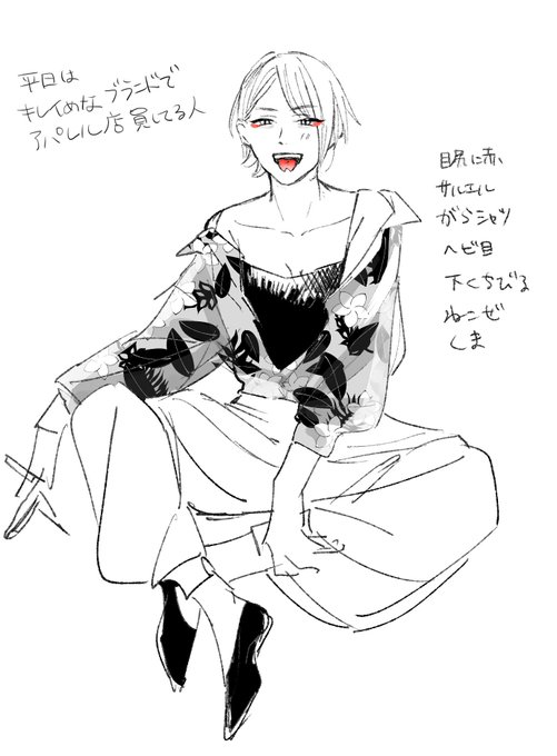 仲間内で要素を出し合ってキャラ描く遊びをしたログ 2枚目は狂人タバコ癖毛むにゅぐち、4枚目は妖怪ツートンヘア黄色い目和服(お気に入り)