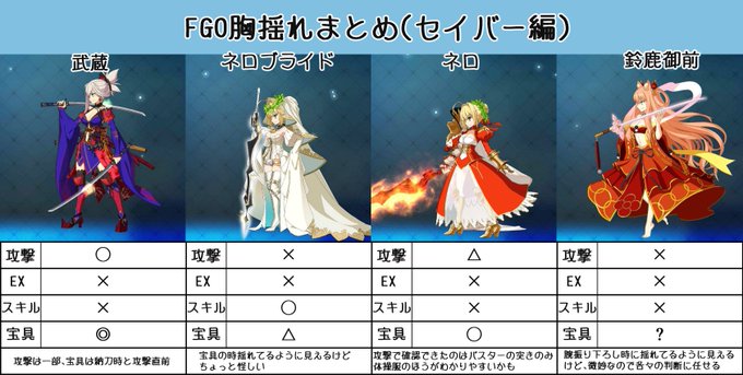 とりあえず2クラス分のまとめ作ってみた。 あくまで参考程度の物なので、もし間違いとかあったら各々の頭の中で補完して。 胸が大きくても揺れが確認できなかったキャラは入れてないのであしからず。 #FGO胸揺れまとめ
