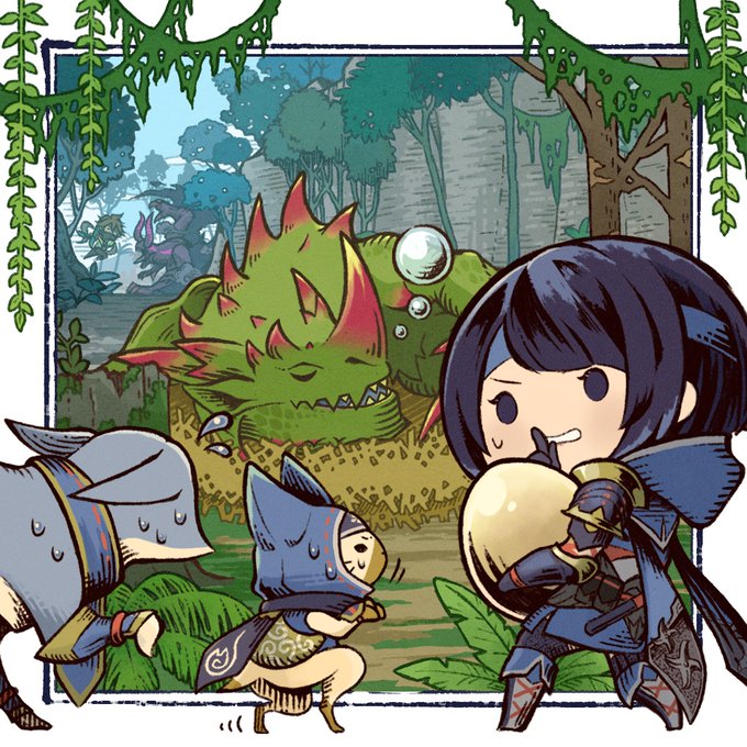 Enjoy this special artwork from the #MHRise and #Sunbreak team ringing in the 2nd anniversary of Monster Hunter Stories 2: Wings of Ruin! It looks like a few friends from the Elgado are paying Ena, Tsukino, and Navirou a visit. ♥