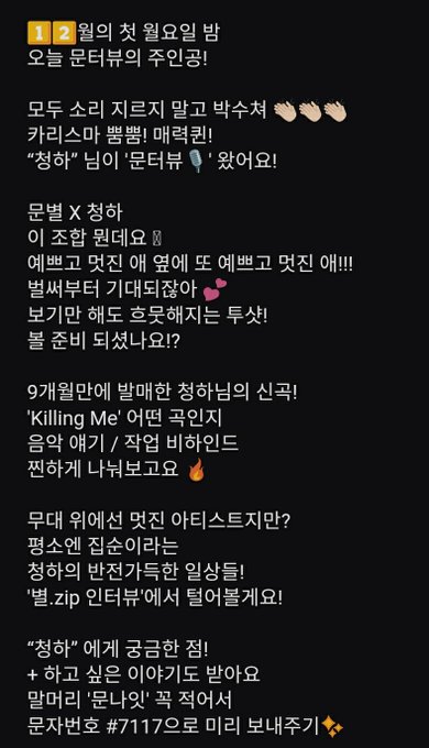 Mon, 6th Dec 🌙Studio Moon Night ⭐Moonterview w/ CHUNGHA⭐ We will get to see Moonbyul x Chungha's chemistry, They will talk about Chungha's new song "Killing Me" music talk/production of the song behind stories ++ #마마무 #MOONBYUL #문별 #CHUNGHA #청하