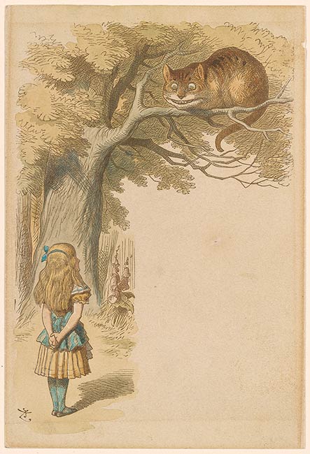 John Tenniel (1820-1914), "Cheshire Cat in the Tree Above Alice," hand-colored proof. Gift of Arthur A. Houghton, Jr., 1987.