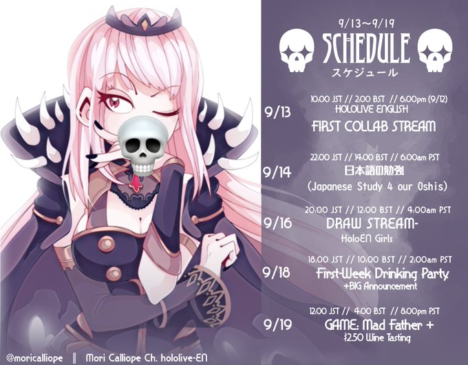 This week’s schedule is finally public! I’ll be taking some days to rest, but there will also be a special EN collab in the middle somewhere, perhaps. :}