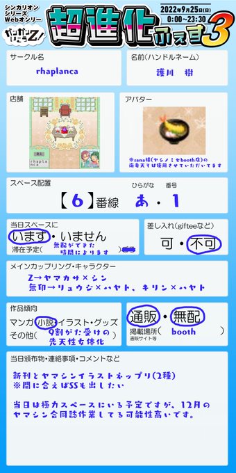 #超進化ふぇすサークル おしながきっぽい何かを練成したので、前日告知になります。 新作は本もネップリもヤマシン一本勝負、9話・10話すっ転びマンのスペースになります。