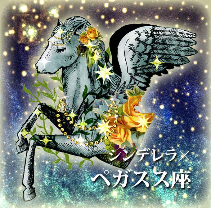 シンデレラの馬車を引く馬にペガスス座を、人魚姫の海で戯れる友達にイルカ座を当てはめて描きました☆彡ペガススは綺麗、イルカは可愛い担当です!(笑)