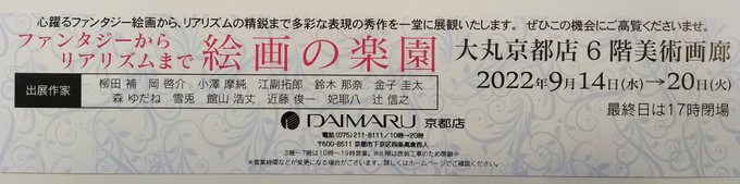 9月20日(火)までの開催となります。 京都の四条烏丸 大丸京都店6階美術画廊にて 「絵画の楽園」 よろしくお願いいたします✨